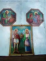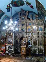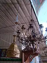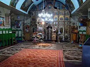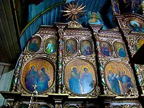Pridvorul are o suprafață de 2,7X3,1 m, cu o fereastră cu gratii de fier, așezată în partea de apus. Din pridvor, printr-o scară din lemn, așezată în dreapta intrării, se urcă în turnul clopotniței. Pronaosul, de formă aproape pătrată, are laturile de cca 4,5 m. Din pronaos se face trecerea în naosul bisericii, care are o lungime de 9,8 m și o lățime de 7,2 m, iar la cele două abside laterale de 11 m. Acoperișul este în formă de leagăn boltit. Pereții sunt îmbrăcați cu scândură de brad, vopsită crem, în anul 2003. Altarul este despărțit de naos printr-o catapeteasmă, cu o lungime de 4,1 m. Picturile de la catapeteasmă sunt realizate în 1926 de pictorul C. Popescu și sunt asemănătoare ca stil celor de la Mănăstirea Agapia[1].