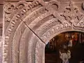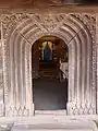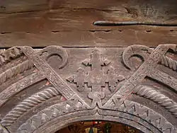 Portalul este compus din trei bârne pe care sunt sculptate șiruri de „X"-uri, având în spațiul dintre ele două brâuri răsucite în sensuri diferite. În triunghiul isoscel format prin întreruperea continuității brâurilor, în partea de sus a portalului, se reliefează ca motive ornamentale crucea, cu brațele duble, iar în colțurile de sus „coarnele berbecului".