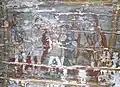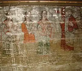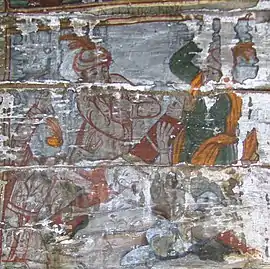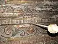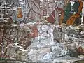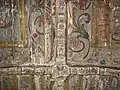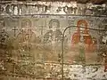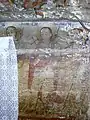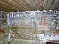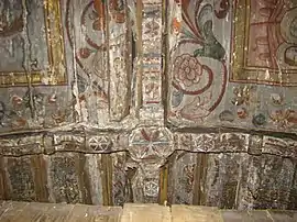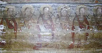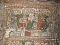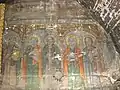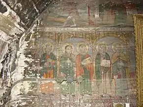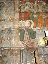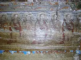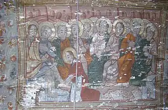 Din ansamblul iconostasului se pot vedea Scena Răstignirii și Registrul Apostolilor, grupați câte doi sub aceiași arcadă. Apostolii, martori ai vieții lui Hristos, au misiunea universală de a duce mai departe mesajul celui care va învia. De aici importanța reprezentării lor pe iconostas. Pe boltă imagini disparate din viața lui Isus: spălarea picioarelor, Cina, Ciclul Patimilor alternează cu desenul decorului floral exuberant. Pe pereții naosului, șirul de mucenici, iar în pronaos figurile de mucenițe și fecioarele înțelepte și nebune, accentuează sacrificiul pentru apărarea credinței creștine și se alătură momentului Judecății de Apoi cu semnificația sa, venirea unei lumi noi. Suprafețele nu sunt plate, ci însuflețite de volume ce transpun intenții de redare a tridimensionalității. Cromatica este dominată de roșu cu nuanțe de închis-deschis. Toate calitățile limbajului plastic sunt afirmate cu talentul unei personalități puternice, exemplificată și în alte biserici, recunoscute ca realizări ale aceluiași zugrav.[1]