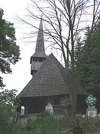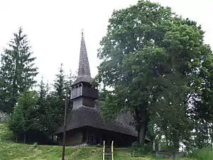 Acoperișul este unul singur, în prelungire, atât pentru naos și pronaos, cât și pentru altar. Biserica este acoperită cu sindrilă. Deasupra pronaosului se află clopotnița bisericii. Turnul are o galerie deschisă, fiind acoperit cu un coif cu baza pătrată.