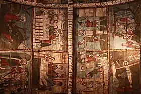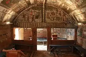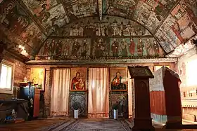 Ploile torențiale din timpul reparațiilor din 1925, au distrus în mare parte pictura pe lemn și pe pânză din interior. În pronaosul tăvănit de mai disting: Sfântul Ioan, Maria, Sfântul Ilie, Sfântul Mare Mucenic Gheorghe și motive decorative cu vrejuri și flori. În naos, care are o boltă semicilindrică, sprijinită pe console treptate, fragmentele rămase ilustrează teme din patimile și minunile lui Iisus. În altar, pe bolta semicilindrică și pe pereți, nu se mai recunoaște pictura. Tot în altar, pe prestolul de lemn masiv, este sculptată o inscripție și anul 1705, anul realizării bisericii. Din patrimoniul bisericii mai fac parte câteva icoane pe lemn, deteriorate, și o icoană pe sticlă, Sfântul Nicolae[2].