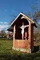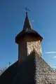 După tradiție, ar fi fost construită inițial după dealul pe care este așezat actualmente satul. Este ridicată, probabil, în anul 1705. Odată cu satul a fost mutată și biserica și amplasată într-un punct cu o frumoasă perspectivă asupra împrejurimilor. În anul 1925, cu ocazia unei refaceri, s-au adus modificări importante construcției. Planul este compus din pronanos cu cinci laturi, cu intrarea în partea de sud, naos și în continuare absida altarului, decroșată, cu cinci laturi. Acoperișul din șindrilă este treptat în dreptul absidei altarului, având deasupra pronaosului un turn nou, pe bază pătrată, cu o galerie scundă și deasupra un coif de mici dimensiuni. Din decorul exterior se remarcă consolele treptate de la îmbinările laturilor altarului, brâul în formă de funie răsucită și rozeta de la ușa de la intare. Ușa de la intrarea în pronaos și cea spre naos au fost mărite la refacerea din 1925, cu această ocazie dispărând și pisania. Interiorul a fost pictat și, după tradiție, inscripțiile ce au existat, menționau ca autori doi meșteri, anul realizării fiind 1768[1].