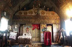 Pereții interiori sunt în întregime acoperiți de picturi murale databile la sfârșitul secolului 19, bine conservate.