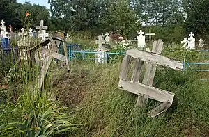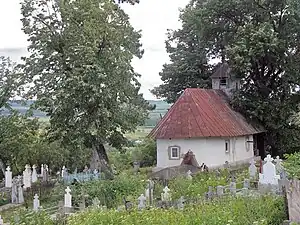 Cimitirul se întinde în spatele bisericii în cuprinsul aceleași incinte. În cimitir se păstrează o colecție variată și valoroasă de cruci de lemn, de piatră, de fier, din marmură și beton. De o deosebită valoare sunt crucile de lemn, local numite troițe, acestea fiind în marea lor majoritate pictate. Ele prezintă o varietate de forme de cruci cu protecție și urme de pictură. Câteva cruci de piatră valoroase de la cumpăna secolului 19 și începutul secolului trecut, practic cele mai vechi păstrate în cimitir, se mai văd în imediata apropiere a bisericii.