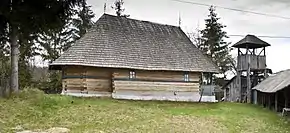 În fața bisericii stă o clopotniță pe patru stâlpi, care servește și drept intrare și troiță.
