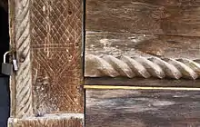Din punct de vedere decorativ, se distinge portalul de intrare, săpat pe ușori și chiar pe canturile interioare cu motive abstract-geometrice. Pe ușorul stâng, în partea de jos, apar patru semne mărunte, două cruci și două stele în cinci colțuri, ce ar putea fi însemne de meșteri. Biserica este încinsă pe din afară de un brău sculptat în relief, cu treceri atente de pe o bârnă pe alta.