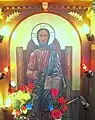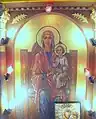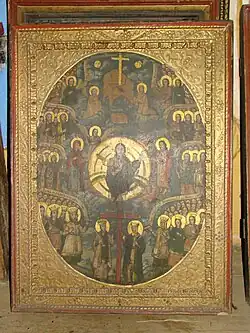 Remarcabilă prin valoarea sa artistică este icoana „Maria cu pruncul-Miluitoarea”, așezată într-o arcadă polilobată, cuprinzând, pe cele două laturi ale ramei, doisprezece prooroci mesianici, înfățișați în picioare, cu volumene desfășurate în mâini. Personajele centrale, încoronate cu diademe și nimburi în relief, se proiectează pe fondul de aur. În partea inferioară a panoului se află următoarea inscripție: „Această icoană au dat la certeză Bustan Dumitru si Drag Nicula, Gane Ioan, Adam Simon, Adam Ion, Petru...msț.sept(emvrie) 13 zile. Și am scris eu popa Ivan zugravu ot Rașinari si Nistor Zugravul. 7229, 1720.”