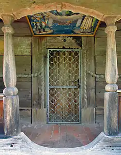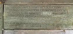 Peste intrare există o a treia pisanie cu următorul cuprins: „ E pisani[e] acestui lăcași și sf[ă]ntă și Dumnezăiască biserică de a treia coperiș cu leatu 1865 în 4 martie cu hramu sfi[n]tulu[i] Nicolae de robu lui Dumnez[ă]u Tănase, pomenește Do[a]mne pre robi titori. Petcu cruc[e]ru, Dumitru cruceru.” Din această pisanie reiese o refacere a acoperișului prin cei doi cruceri semnați în încheiere.