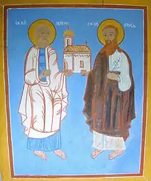 Icoanele împărătești: „Maria împărăteasă cu Pruncul” (și arhangheli în spatele tronului) și „Deisis” sunt opera lui Gheorghe zugravu, fiind realizate în anul 1854. Tot el este și autorul icoanelor din pronaos: Maica Domnului Hodighitria, Ioan Botezătorul, Sfântul Nicolae, Sfântul Gheorghe străpungând balaurul și Sfântul Dumitru, pe cal, cu sabia ridicată asupra împăratului păcătos (ultimele două icoane de o remarcabilă valoare artistică)[7].