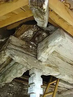 Acoperirea interioară este formată dintr-o boltă în leagăn peste naos, iar la altar intersecția de bârne drepte cu fâșiile înclinate.