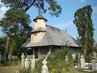 Cea mai veche dată păstrată despre ea este 1780, când se spune că a fost construită de popa Sandu Ghiga[2]. În 1909 era menționată ca fiind în „stare rea”. Este exact anul în care a fost ridicată noua biserică parohială de zid, cu același hram. Dacă pe usciorul stâng al intrării se poate descifra văleatul „7304” (1795-1796), câteva trăsături îi pot coborî vârsta în prima parte a veacului: peretele plin între pronaos și naos, peretele vestic, cu ușciori masivi, pragul de sus fiind marcat prin crestături, zăvorul de lemn al ușii de intrare[3].