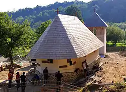 În fața bisericii stă o clopotniță de zid a cărei frumoasă pictură murală este datată pe latura de sud din „1843 iulie 22”.