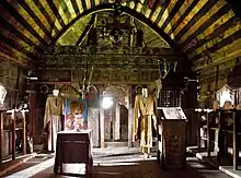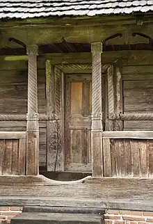 Toate aceste eforturi de a intensifica emoțiile artistice din pridvor sunt legate de intrarea în biserică și trecerea în spațiul ei sacru închis. Ușa este înconjurată de un portal, la rândul lui bogat sculptat în relief și basorelief. Funia puternic profilată de pe portal se desprinde și continuă pe cele două părți într-un brâu median ce înconjoară întreaga bute a lăcașului. Butea este ridicată din bârne de stejar atent fățuite, încheiate la capete în cheotori netede bisericești, în coadă de rândunică. Capetele bârnelor din partea superioară a pereților sunt lăsate să iasă în exterior, în formă de console profilate, cu scopul de a susține cosoroabele. Acestea din urmă formează talpa de sprijin a acoperișului protector.