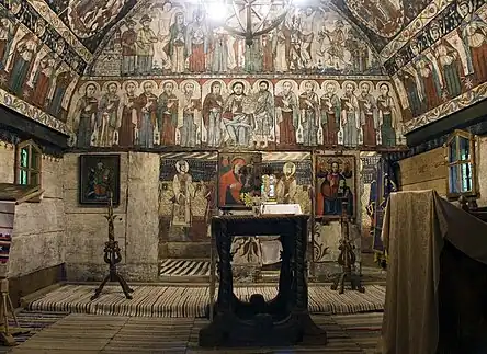 Interiorul pictat al bisericii provine din anul 1742, după cum o dovedește pisania aflată în stânga iconostasului, în partea superioară, a cărui transcriere o redăm mai jos: "Acestu frontaru svuntu lau răscumpearat Nistor Gheorghie cu feciori lui, cu Gherman și cu Nistor și cu Gevrilă și cu gasda alu Maria Petrui, pomănirea aloru, pomane în viaci, pomane loru, anul de la H[ri]stosu 1742". Se mai păstrează o frumoasă pictură parietală datată din 1742. Biserica se află pe noua listă a monumentelor istorice sub codul LMI: SB-II-a-A-12012, ce cuprinde Muzeul Tehnicii Populare din Sibiu în ansamblul lui.