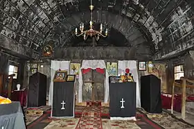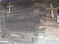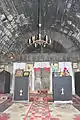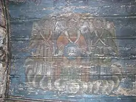 Pereții interiori sunt acoperiți cu aștereală de brad, pe care s-a aplicat pictura. Aceasta pare a fi de la începutul secolului al XlX-lea după unii specialiști, după alții din a doua jumătate a veacului al XVIII-lea. În altar a fost pictată "Sfânta Treime", o scenă mare, flancată de-o parte și de alta de Sf. Mihail și Gavril cu soborul îngerilor. Pe cele trei triunghiuri sferice este zugrăvită Maria Orantă, iar pe pereții laterali apar marii ierarhi ai bisericii. Ușile împărătești sunt simple, păstrate în stare bună; în registrul superior este pictată Bunavestirea, iar în cel inferior sunt Sf. Petru și Pavel. Din icoanele împărătești se mai păstrează două: Maica Domnului cu Pruncul și Isus arhiereu. Pe peretele iconostasului dinspre altar găsim următoarea inscripție: "Pomenește Doamne pe robul tău preotul Vichentie Triponescu. 1862". Deasupra ușilor Isus și cei 12 apostoli, în timpanul de vest al naosului apare o scenă mare: Coborârea de pe cruce. Pereții laterali mai păstrează pictura doar înspre strane: în dreapta Sf. Mihail și Dimitrie, iar în stânga Sf. Gheorghe și Theodor Tiron.