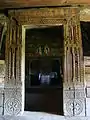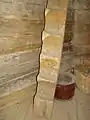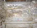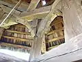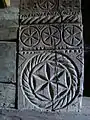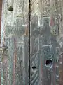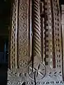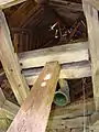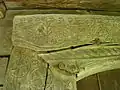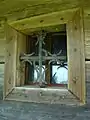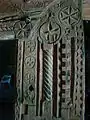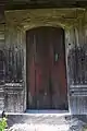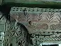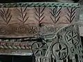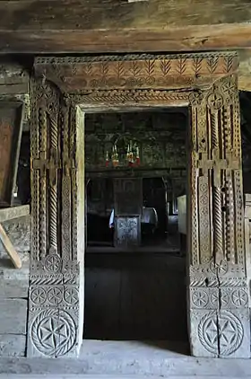 Decorul sculptat: Ancadramentul ușii de intrare în biserică este decorat cu motive incizate, precum romburi, pătrate, dinți de fierăstrău și frânghia răsucită. Aceleași motive se repetă și la ușa de acces în naos. Grinzile bolții au fost decorate cu motivul rozetei.