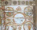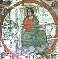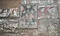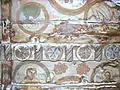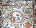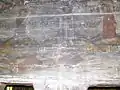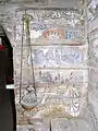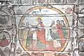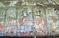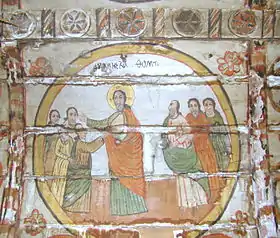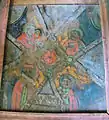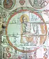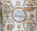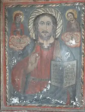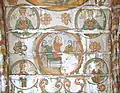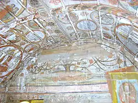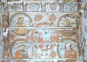 În interior, în pronaosul tăvănit, picturile s-au distrus. De o parte și de alta a ușii de acces în naos atârnă două icoane pe lemn din secolul al XVIII-lea, reprezentând Încoronarea Domnului și un Deisis. Dincolo de peretele despărțitor, bolta semicilindrică de scândură (cerimea), cât și pereții naosului, au păstrat picturile de la sfârșitul secolului al XVIII-lea (1794). Ciclul iconografic se desfășoară de la sud spre vest și nord. Patimile Domnului au fost redactate într-un limbaj popular naiv, dar nu lipsit de pitoresc și pe alocuri de note caricaturale. Dincolo de gesturile stângace, de mișcările nefirești și figurile stereotipe, artistul popular a reușit, prin alegerea unei palete cromatice adecvate, să dea vioiciune scenelor imaginate. Bolta a fost împodobită cu figurile evangheliștilor și cu busturile unor prooroci sau mucenici. Tot pe leagănul bolții au fost pictate scenele Vindecarea orbului și Duminica Tomii. Din pictura absidei altarului se mai distinge scena Jertfa lui Isaac.[3]