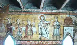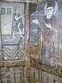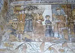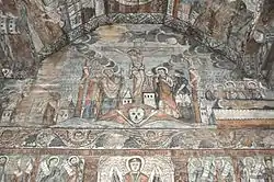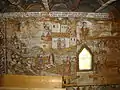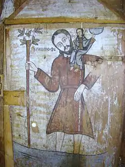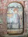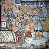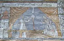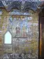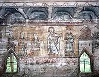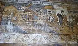 - Sub fereastra crâsnicului, peretele de nord în navă:[22] "Înpotriva sf[intei] ... sau zugrăvit pravoslavnica beserecă aceștie să [nu fie] cum cinstiților, și întru H[risto]S [sf/fra/iub]iți, preoți și dascăli și mireani această d[u]mnazăescă ... să nu cumva hulum înpotriva cine ști mai bene să îndireptaze pre noi mult e[s]t[e] jitie a sfinților pe[rinți]"