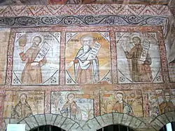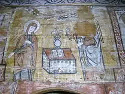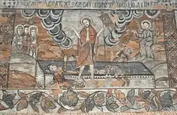 - Sub fereastra diacului, peretele de sud în navă:[23] "... care era întru începutu, care amu auzitu, care văzutu cu ochii noștri la ceea ce și mâinile noastre au pipăitu ... arătat ș'am văzutu și mărturisit cu sămnulu a tuturora sf[i]nților."