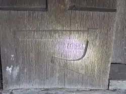 Detaliu la portalul intrării. Pe fiecare parte a intrării se află o bardă. În micul chenar din imagine avem însemnul meşterului. Foto: 2009