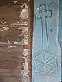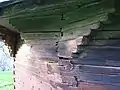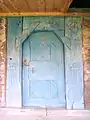 Decorul sculptat. Ușa de intrare este străjuită de un ancadrament din lemn de stejar, decorat cu rozete și cu inscripție incizată indicând anul construcției.