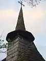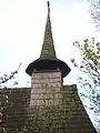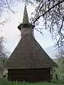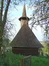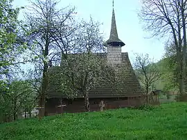Biserica de lemn cu hramul „Sfântul Dumitru” se pare că a fost ridicată sau refăcută la începutul secolului 19. Despre acest lucru vorbește pisania de pe portalul de la intrare, care amintește următoarele date: „An 1804, în zilele împăratului Franțișcuș, fiind arhiereu Bob Ioan, când au fost Merc[i]e Iremea lu Andrei preot fiind satului și cu soțu său Titiane”.[1] Cert este că această construcție de mici dimensiuni are caracteristici arhaice cu pronaos tip tindă, fără decupări laterale ușii de acces în naos, acoperiș simplu în patru ape, decroșat, prevăzut cu un mic coif cu cruce în față și un turn-clopotniță, ce se ridică direct din acoperiș, cu foișor și balcon, peste care se înalță un coif octogonal la bază și rotund spre vârf, spijinit pe pe patru stâlpi prinși de o cunună dublă suprapusă într-o cruce. Stâlpii de susținere sunt dublați pe laterale de contrafișe solide, modelate în trepte rotunjite, iar parapetul șindrilit are o balustradă frumos decorată cu torsada scoasă mult în relief. Ancadramentul ușii de la intrare, cu partea superioară în acoladă, are decorațiuni incizate și un relief cu dinți de ferăstrău, zig-zaguri, inimi, cruci și torsade, precum și o inscripție în grafie slavonă foarte bine păstrată. De remarcat este faptul că grinda de postament de pe latura sudică este fasonată în două trepte: una de jos, ieșită în afară și alta retrasă la nivelul grinzilor ce sunt îmbinate la colțuri în coadă de rândunică, iar cele de sus se prelungesc pentru a forma niște console mici, atent rotunjite[2].