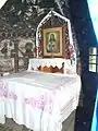 Ușile împărătești nu mai există, dar portalurile lor au pictate chipul Sf. Eftimie cel Mare și al Cuviosului Antonie, iar deasupra acestora se desfășoară în trei registre pe fond albastru scene specifice tâmplei, închise în coloane și medalioane circulare, legate între ele prin inele ce creează impresia unui lanț. Deasupra ușilor împărătești se desfășoară un brâu în relief, pictat cu motivul torsadei și volutei, al dinților de ferăstrău, romburi și acolade ce continuă și pe pereții laterali, la același nivel sub forma torsadei. Altarul păstrează, de asemenea, câteva scene și chipuri de Sfinți, în aceeași cromatică plăcută ochiului, cât și o Sfântă Masă din piatră cioplită și unele obiecte de cult, cum ar fi o cruce de lemn sculptată, două cădelnițe și câteva sfeșnice.