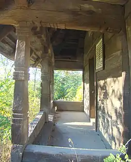 Remarcabilă prin execuție este și prispa, cu fruntariul tăiat în arcade mărunte și stâlpii sculptați într-o succesiune de volume, marcate de striuri și de chenare în dinte de lup[7].