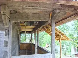 Prispa, de pe latura de vest, are fruntarii cu crestături în acolade, stâlpi cu fusul în torsadă, stenapi cu profil în frânghie[5].