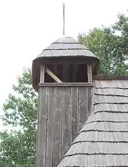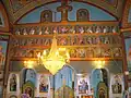 Acoperișul este învelit în șiță, în timp ce elevația interiorului cuprinde o boltă în leagăn peste navă și intersecția de fâșii curbe peste altar[6].