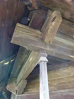 Există prispa obișnuită la bisericile gorjene, pe latura de vest, cu fruntarii tăiate în acolade, în timp ce o temelie rectangulară înscrie poligonul altarului, realizând și acolo, de o parte și de alta, o prispă cu stâlpi de colț[5].