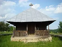 Pereții, cu bârnele aparente, înscriu o navă dreptunghiulară, cu altarul poligonal, cu cinci laturi, decroșat numai în registrul de jos, pe laturile de nord și sud[3]. Acoperișul este învelit în tablă, fără clopotniță, aceasta, pe un singur nivel, aflându-se separat, pe sud-vest.