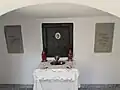 Intrarea se află pe latura de sud și are un ancadrament sculptat (cu chenare geometrice, frânghie, cruci, căni cu flori); ușa, cu stinghii dispuse în raze și un panou central cu rozetă, se aseamănă cu cele de la bisericile din Munții Apuseni[4].