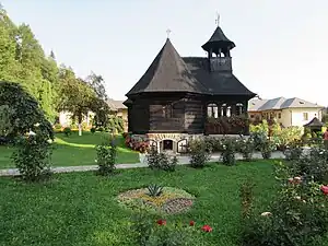Biserica a fost adusă din localitatea Stânceni, unde a fost înălțată în anul 1847, în zilele episcopului Vasile Moga, a protopopului Zaharia Matei, cu îndemnarea și osârdia preotului Gheorghe Ujică și a fiilor săi[2]. Biserica strămutată a fost așezată, în anul 1910, în localitate natală a primului patriarh al României reîntregite, Elie Miron Cristea, cel care a creat așezământul monahal, sfințit la 21 octombrie 1928[3].
