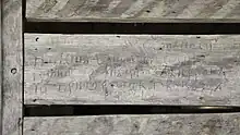 Un moment important din trecutul bisericii este redat de pisania cioplită în peretele de apus, în dreapta intrării. Textul în limba română cu litere chirilice reține următoarele: „Să să știe căndu sau tărnosit această sântă biserică în zilile pre înălțatului d[o]mn Ion Grigore Ghica voivod m[eseț] febr[uarie] 2[4], 7259”.[1] După cum reiese din pisanie, biserica a fost „târnosită” în anul 1751, în timpul domniei lui Grigore II Ghica. Ea a fost sfințită și nu făcută atunci, observație făcută și de cercetătoarea Ioana Cristache-Panait, care indică o vechime mult mai mare pentru acest lăcaș.[2] Trebuie remarcată în acest sens și crucea de piatră din fața intrării, datată anterior, din anul 7231 al erei bizantine, adică anii 1722-1723 ai erei noastre. Pe fața ei se poate citi următoarele: „Cu vrearia Tatălui, și cu ajutoru Fiului ridicatusau această sf[ă]ntă cruce întru cinstia și slava Uspenie B[ogorodi]țe[3] în zile lui Nicolae voivod și sau ostenit robul lui Dumnezău Ion Mestecăneanu, Toader, Stana, Ion, Ioana, Dobrici, Drăgoi, Zoița, Stan, Stanca, Șărbu, Stoiana, Mihalcea, Voica, Mihalcea”, iar pe latura stângă textul continuă cu: „Er[o]monah Stefan, Maria Preda, Pătru, Radu, Rada, leat 7231, Radu Dobrotă, Ene, Cărstiana, Păuna”. Pe latura dreaptă apar semnăturile celor doi meșteri pietrari: „Ion Bică” și „..ca Balea”.
