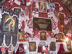 În interior, pereții bisericii au fost tapetați cu catifea sau material ce culoare roșie și multe, multe prosoape trandiționale. Astfel, pictura realizată în 1783 de Samoki Teodor din Kașa a fost acoperită. Ușile altarului au fost pictate în anul 1793 de către David Zugravu de la Curtea de Argeș[2].
