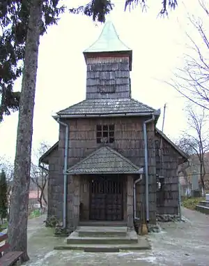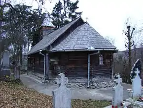 Biserica de lemn este prețuită de obște, simțămînt vădit în starea sa de îngrijire și a întregii incinte de brazi. În secolul XX (1920, 1980) edificiul a suferit intervenții majore (amplificarea părții de vest, refacerea acoperirii interioare), dar analiza sa permite detașarea embrionului de la mijlocul veacului al XVIII-lea. . Acesta este constituit din nava de 7,20 m și absida altarului, decroșată, poligonală, cu cinci laturi (acoperită cu o boltă semicilindrică, intersectată de fâșii curbe). Traveea de est a bolții naosului a fost înnoită, materialul recuperat a fost folosit la încăperea nouă, cu destinație de pronaos. Pe pereții acesteia, ca și pe cei ai pronaosului inițial, se observă fragmente de pictură, de la sfârșitul secolului al XVIII –lea (mucenici, judecarea lui Is.Hs.), ce pot fi atribuite lui Toader Popovici zugrav.
