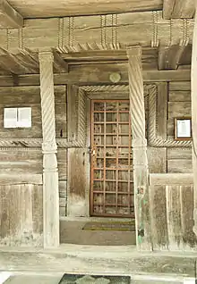 Portalul de la intrare păstrează un motiv interesant sculptat pe ușorul drept, sub funie, un puiet de paltin de munte. Paltinul este cunoscut împreună cu teiul drept materialul prin excelență folosit ca suport pentru icoane, fiind preferat de mai toți crucerii din sudul țării. Puietul de paltin poate astfel fi atât un simbol al pomului vieții, bine cunoscut în decorul religios și des întâlnit pe portale, cât și o posibilă marcă de recunoaștere a meșterului crucer care a sculptat decorul bisericii.[11]