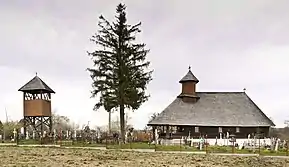 În fața bisericii stă o clopotniță pe patru stâlpi.