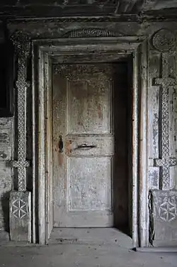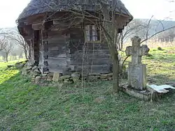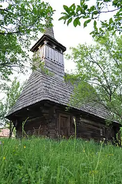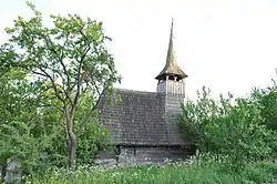 Biserica de lemn cu hramul „Sfinții Arhangheli Mihail și Gavriil”, apoi „Sfântul Nicolae”, despre care la începutul secolului al XX-lea, se știa că este „foarte veche”, a fost construită în jurul anului 1700, în mijlocul unei păduri de pe Dealul Bisericii, în partea de miazănoapte a satului. Lăcașul, ridicat pe o fundație de piatră, este împărțit în pronaos, naos și absida altarului de formă pentagonală decroșată. Turnul înălțat deasupra pronaosului este o prismă cu secțiunea din plan pătrată, prevăzut cu un foișor deschis prin arcade semicirculare și încoronat cu un coif tronconic. Accesul se face pe latura de sud. În interior prima încăpere are tavan, iar naosul și absida altarului au fost acoperite cu câte o boltă semicilindrică.