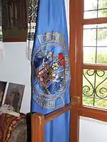 Steag cu stema Mitropoliei Ardealului în biserica de lemn din Netuș