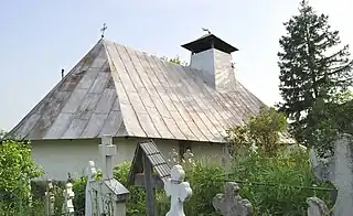 Biserica este clădită din lemn, pe o temelie de piatră, tencuită cu var pe dinăuntru și afară, cu o turlă deasupra naosului. Nu este pictată în afară de catapeteasmă. Are formă de corabie și este acoperită cu tablă zincată. Nu are inscripții interioare sau exterioare. Patrimoniul mobil cuprinde 8 icoane, cea mai veche datează de la 1816. Icoanele Împărătești, cu Domnul Iisus Hristos și Sfânta Fecioară Maria, sunt pictate în 1865 de pictorul Pârvulescu, iar icoanele cu Sfântul Ierarh Nicolae și Adormirea Maicii Domnului de zugravul Georgică Damoca, în 1862, respectiv 1863. În stânga bisericii se află clopotnița.