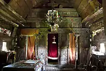 Structura originală a bisericii se păstrează în bune condiții. Stă pe o fundație de cărămidă, și este acoperită cu un acoperiș unic de șiță. Butea este ridicată din bârne fățuite din bardă, încheiate cu cheotori netede, bisericești, în coadă de rândunică. Turnul este ridicat scurt peste tindă. Planul construcției se desfășoară de la vest la est și este împărțit între pridvor, tindă, naos și altar. Pridvorul este spațios, mărit într-o etapă ulterioară cu suprafața dublă celei inițiale. Printr-un portal original, cu funii groase scoase în relief, se trece spre tinda femeilor. De aici, se trece prin încă un portal în naos sau biserica bărbaților. Aceasta este cea mai încăpătoare dintre încăperi, acoperită cu o boltă de lemn. Trecerea spre altarul îngust, terminat în cinci laturi, se face prin trei uși. Altarul este acoperit de o boltă propie și în întregime pictat. Se pot găsi asemănări cu pictura interioară din biserica de lemn din cătunul vecin Sânculești, databilă 1864.