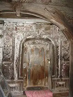 Ancadramentul intrării este un adevărat poem al sculpturii în lemn: cu rozete, „frânghii”, motive geometrice, semicercuri cu spițe și vrej cu ghindă. În mijlocul cadrului de sus, amplei compoziții decorative ce susține crucea i se adaugă, de o parte și de alta, o inimă. Cel de al doilea ancadrament, al trecerii în naos, este împodobit cu chenare în „frânghie”, linii frânte și alte linii dispuse în V întors. Arcul transversal al bolții semicilindrice a naosului este străbătut de o „frânghie”, intersectată de șase suprafețe dreptunghiulare pe axul arcului, în care sunt sculptate câte o rozetă în spirală sau cu petale[3].