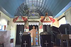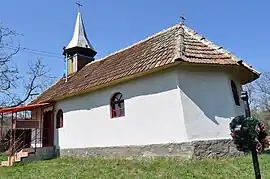 Este un edificiu de plan dreptunghiular de mici dimensiuni, cu absida nedecroșată, poligonală cu trei laturi. Deasupra pronaosului se înalță o clopotniță miniaturală din scânduri, cu foișor deschis și coif suplu, învelit în tablă. La acoperișul propriu-zis s-a folosit țigla. Atât la interior, cât și la exterior, bârnele au fost tencuite, strat reîmprospătat periodic prin văruire. Intrarea este amplasată pe latura sudică. Lăcașul, renovat în anii 1998 și 2007, a fost precedat de o ctitorie obștească din bârne, de la care s-au moștenit câteva icoane prăznicare valoroase, reînnoite de pictorul amator „Franz T.” din Toc, județul Arad în 1933. Acel edificiu figurează atât în tabele conscripțiilor din anii1733, 1750, 1761-1762 și 1805, cât și pe harta iosefină a Transilvaniei (1769-1773][1].