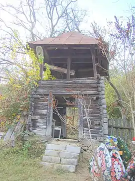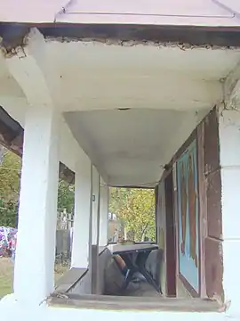 Pridvorul are cam un metru lățime, are zugrăvite două scene biblice: Sfântul Gheorghe omorând balaurul și Sfinții Arhangheli, realizate de pictorul local Constantin Cusma[3]. Stâlpii pridvorului sunt îmbrăcați în scândură și nu se mai poate observa dacă au avut ornamente, iar ușa nu mai este cea originală[4].
