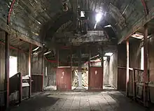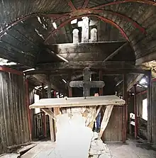 De la vest la est, biserica este împărțită în cele patru încăperi tradiționale: pridvor semideschis, tindă, naos și altar. Altarul este mai îngust și terminat poligonal, în cinci laturi. Trecerea dinspre tindă spre naos este marcată de stâlpi și un pălimar de scânduri. Iconostasul este original și are trei uși. Tâmpla lui este formată din câteva bârne transversale peste care se ridică crucea și moleniile pictate. Tâmpla păstrează contururile apostolilor pictați în picioare. Profeții au fost pictați în medalioane pe un arc îngust sub boltă. Bolta e pictată din loc în loc cu stele. Încăperile sunt luminate de un număr redus de ferestre, mult mărite, probabil, într-o fază ulterioară. Interiorul este peste tot acoperit cu blăni verticale de lemn.