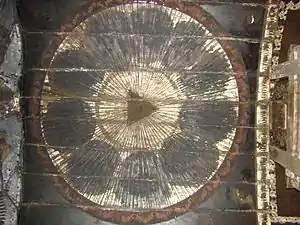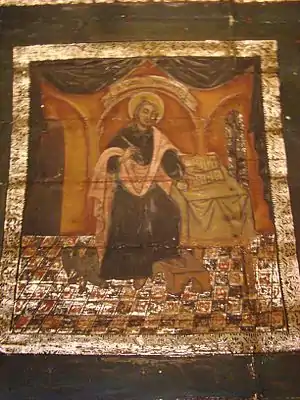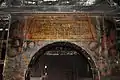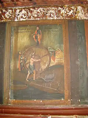 Pisania din partea interioară a fruntariuiui altarului de deasupra ușilor împărătești, spune: "Această sfântă bisiarică, cu mila și cu ajutoriul pria î(n)ălțatului, și atotputiarnicului milostivului Dumnezău sau zidit, și cu tot lucrul ce era de lipsă sau gătit de la î(n)ceputul lui maiu, al anului 1827, până la sfârșitul lunii iarăș a lui maiu al anului următoriu 1828, supt pre lăudata și putiarnica biruință a pria î(n)ălțatului î(n)tiia Franțisc î(m)păratul Austriei. Supt stăpâniria arhierească a Sfinției sale luminatului și pria Osfințitului D(o)mnului d(o)mn episcop al Făgărașului Ioani Bobe nemeș de Kápólnok Mónostór dintru acest vidic al Chiuvarului și supt ocîrmuiria a cinstitului protopop de la Ciocmani Mezei Lupp. Iară cu zugrăvitura și cu podoaba ce să viade peste tot dinlăuntru, afară de douo cinstite icoane ce sunt î(n) oltariu pe pristol și cealaltă pe fruntariul oltariului dinainte:/ sau gătit î(n)) anii d(o)mnului 1832 și 1833 cu strădania, cu lucrul și ajutoriui chieltuialelor tuturor sătianilor fiește căruia după buna î(n)durare, voința inimii și puteri(i) sale, fără de nicio sâlnică aruncare, î(n)să cu toată cheltuiala ce sau potrivit sau cuvinit; î(n) bani de jumătate a cinstitului domn perțeptorului crăiesc acestui cinstit vidic și a satului fiucorator Nicolae Hosu, care mai întiiu după măsuraria pământului (e vorba de măsurătoarea cadastrală ordonată de împăratul Iosif al II-lea în 1786 – n. n.) în care au străduit 4 ani, au fost soriitoriu varmeghiesc 5 ani, diacii solgăbirău î(n) 15 ani, iară mai pe urmă de la î(n)ceputul anului 1810 pînă î(n) anul de acum curgătoriu 1836, din mila lui Dumnezău de 26 de ani pe al 27-le (un cuvînt indescifrabil n. n.) perțeptoriaște".