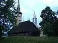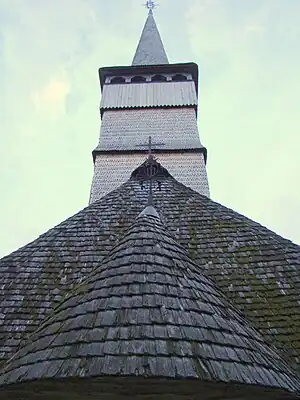 Biserica din lemn de stejar cu hramul „Sfinții Arhangheli” a fost construită probabil în a doua jumătate a secolului al XVIII-lea. La 1900 biserica avea hramul „Sfântul Nicolae”. Perioada în care a fost construită această biserică a dat edificii cu planimetrie, elevații și proporții impunătoare. Monumentul are următoarele dimensiuni: lungimea de 13,15 m, lățimea de 7.80 m și înălțimea de 23 m. Pereții la rândul lor au înălțimea de 2,50 m și grosimea de 25 cm. Planul bisericii este dreptunghiular, cu absida altarului decroșată, pentagonală. Acoperișul are două corpuri, iar învelitoarea este din draniță de brad, așezată în trei straturi. Acoperișul de deasupra prispei are o formă semiconică. Pridvorul are trei arcade largi, cu contrafișe, decorate cu motive alveolare. Deasupra pronaosului se înalță turnul de plan pătrat, cu o treaptă la mijloc. Turnul are un balcon în consolă, învelit cu scânduri și 16 arcade realizate cu ajutorul contrafișelor drepte. Deasupra balconului se înalță coiful zvelt, cu baza un trunchi de piramidă pătrată și o fleșă-piramidă octogonală. Exteriorul bisericii se mai remarcă prin aripile laterale, capetele bârnelor tăiate în formă de trepte, având rol de console, și prin pereții înalți, formați din cinci bârne orizontale (talpa plus patru cununi). Pe unul din pereții exteriori ai altarului se află incizată o cruce greacă, cu un potir deasupra, totul încadrat în inscripția: „1864 AD”, care poate reprezenta data resfințirii bisericii după o importantă reparație.