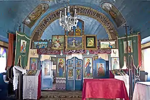 Intrarea în biserică se face pe latura de vest. Această intrare este adăpostită de către pridvorul care, în urma lucrărilor recente de renovare a fost închis. Intrarea duce în pronaosul bisericii care este tăvănit și este despărțit de naos de un zid despărțitor, plin doar în partea inferioară. Naosul este acoperit de o boltă semicilindrică. Pentru a mării spațiul bisericii, în partea vestică a naosului a fost ridicat un mic balcon. Trecerea din naos în spațiul ce adăpostește altarul se face prin intermediul a trei uși. Altarul este acoperit de o boltă sub forma unui semitrunchi de con închis cu un timpan.
